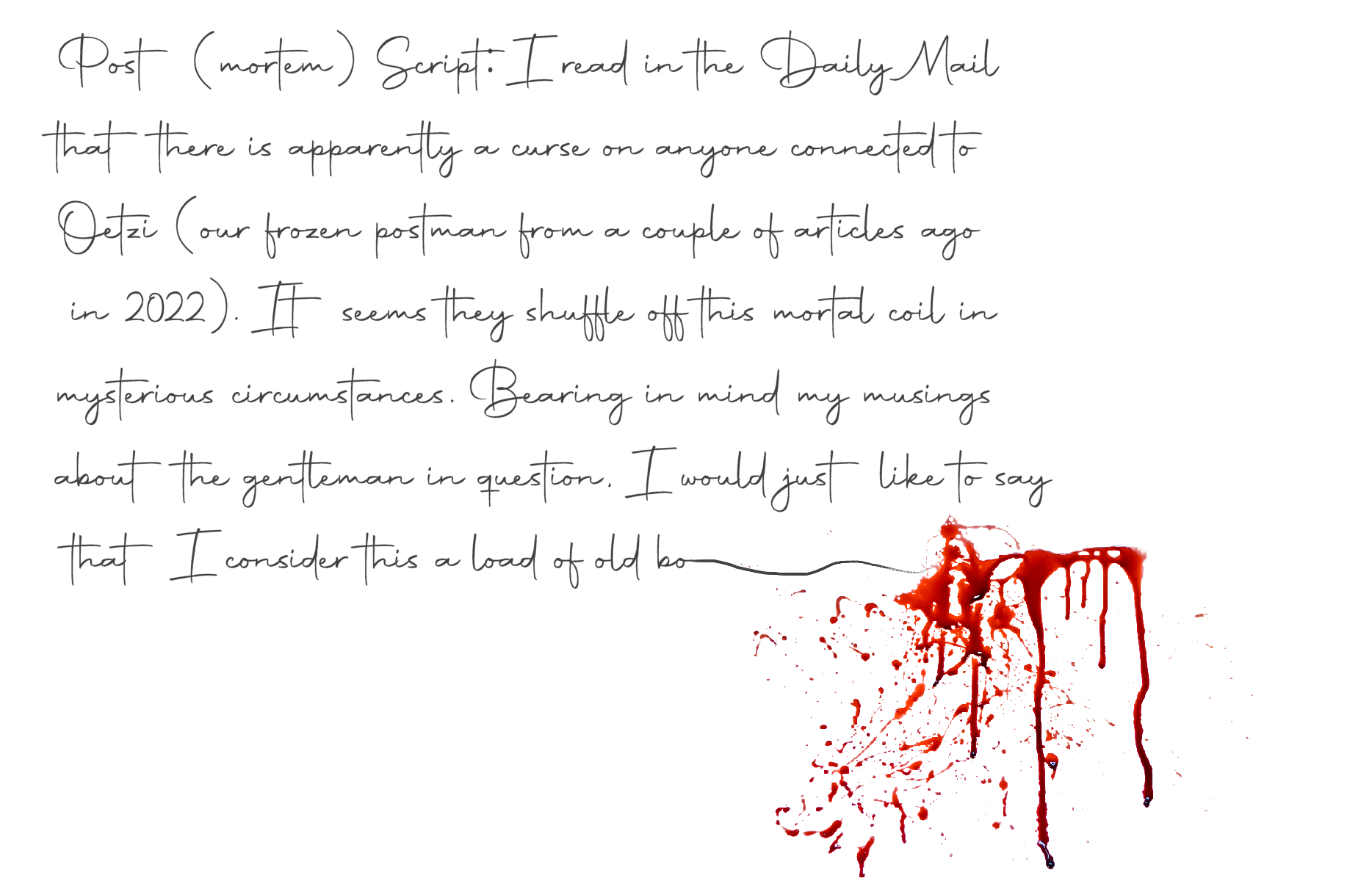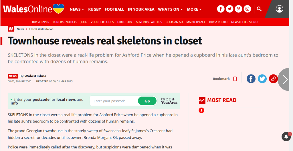 So, Auntie Price kept a body in the wardrobe? Was it a travelling salesman, caught ‘in flagrante’, who quickly had to hide when Uncle Price came home? Ah, but they were Bronze Age bones. Right, we aren’t given the age of Auntie or the wardrobe. Perhaps he was just a very old salesman who did not want to retire. Or, maybe we now know where some of those mountain postmen disappeared to…